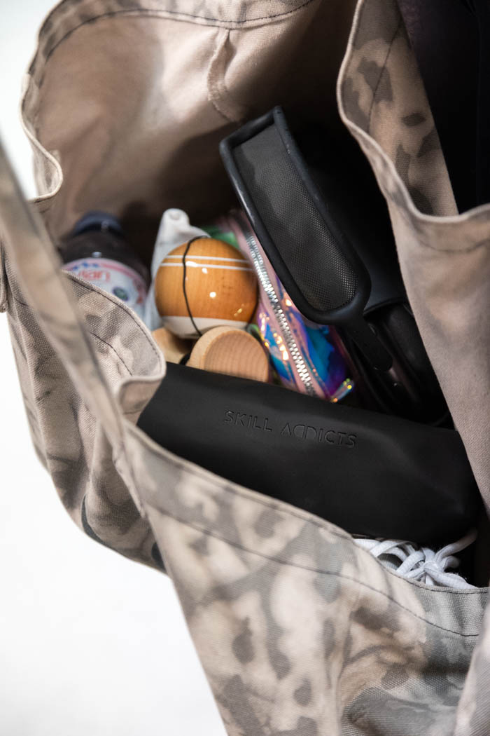 Just pack your skill toy essentials ( yoyos, juggling balls, accessories, spin tops, footbags). Then just zip it, clip it to your backpack or toss it in your main bag to keep your setup organised and easy to find during whole day wherever you go.